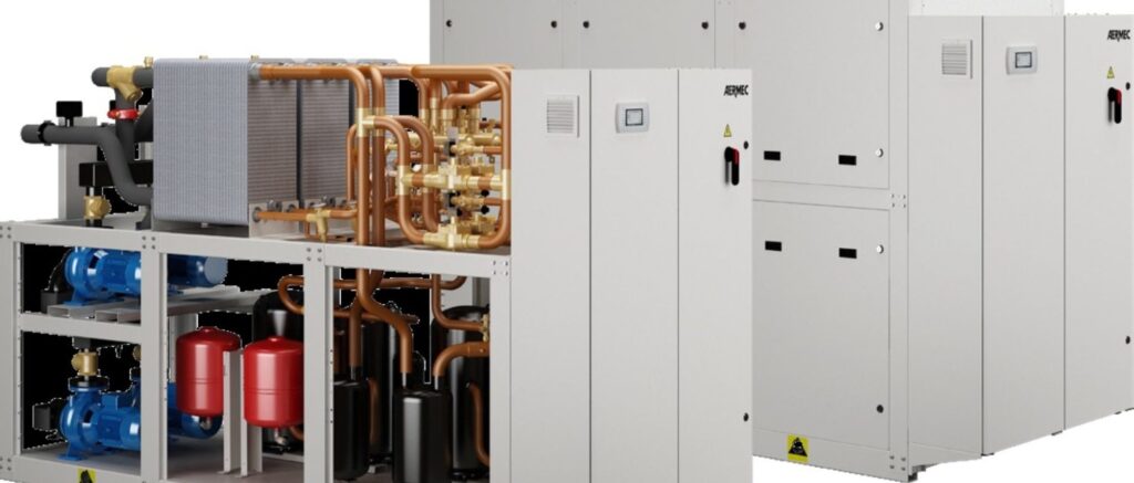 3 × geothermal 4-pipe heat pumps AERMEC NXP and 4 × air-cooled heat pumps AERMEC ANL with FCZ-PO, VED fan coils and FCL cassette units