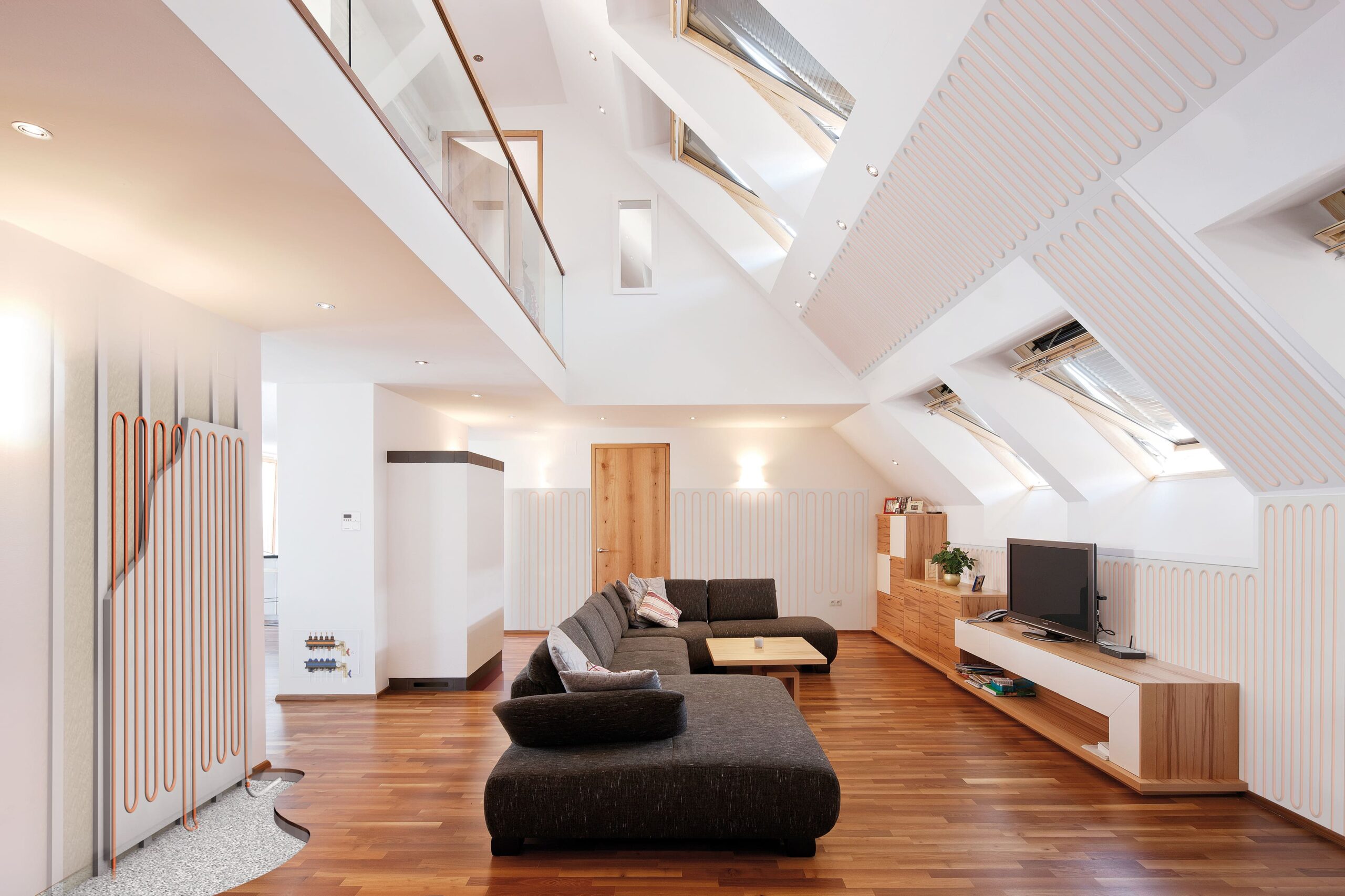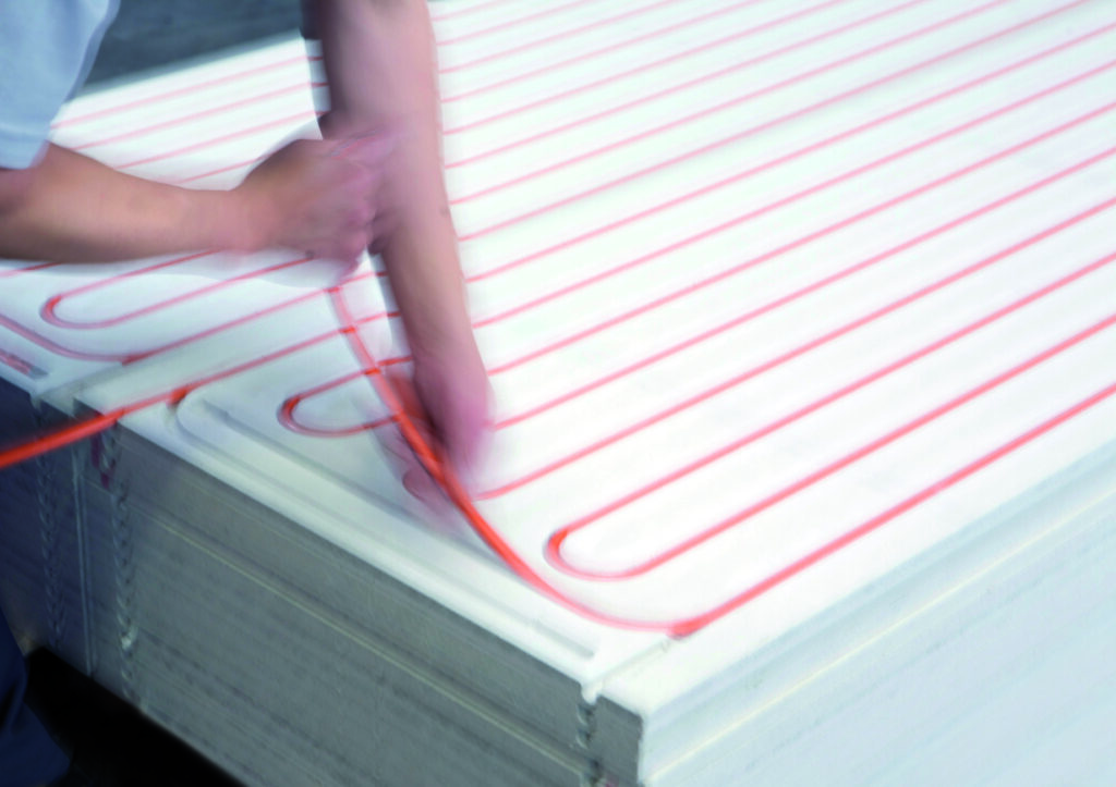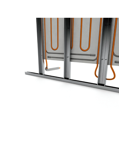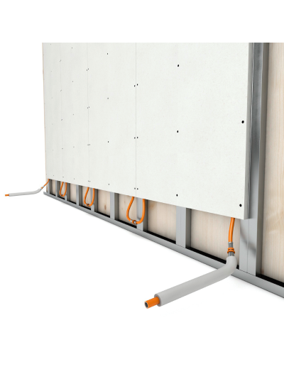 The Modular Wall drywall system is an integrated heating/cooling system consisting of 18mm thick Fermacell® fiberboard panels with pre-installed Variomodular 11.6×1.5 Laser laminated pipe in 75mm pitch. Fiberboards have pre-marked screw holes in their visible appearance for easy and safe fixing to the metal frame.