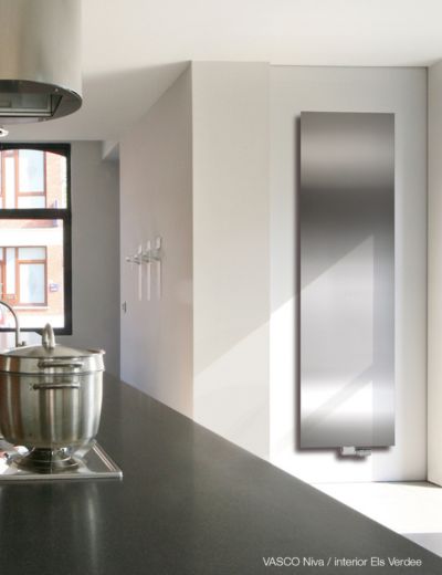Η επίπεδη πρόσοψη του θερμαντικού σώματος ΝΙVA και οι καθαρές σχεδιαστικές γραμμές του, συνθέτουν ένα περίγραμμα που προσδίδει ιδιαίτερη αισθητική στη διακόσμηση του χώρου.